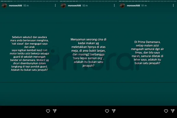 “Di mana keadilan buat saya dan anak saya yang menderita dan berdiam diri lebih 15 tahun apabila netizen bersuara “kau kena diam”. Adakah kami akan berterusan menjadi kambing hitam Azizi, hanya kerana kami tidak ada kroni dan saya ibu bertatu? TIDAK ADA. Yang ada hanya ‘racist.” Coretnya