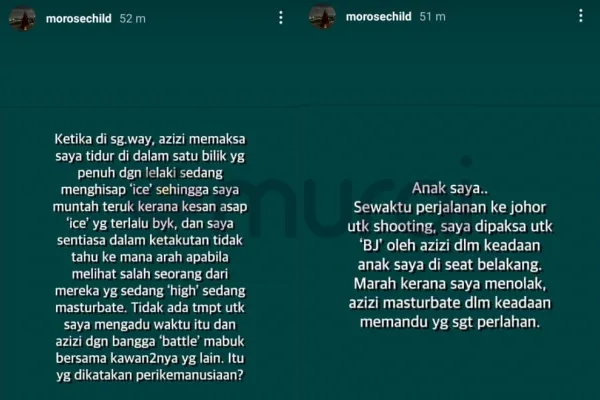 “Anak saya.. Sewaktu perjalanan ke Johor untuk pergambaran. Saya dipaksa untuk ‘BJ’ oleh Azizi dalam keadaan anak saya di tempat duduk belakang. Marah kerana saya menolak, Azizi onani dalam keadaan memandu yang sangat perlahan.” Tulisnya lagi