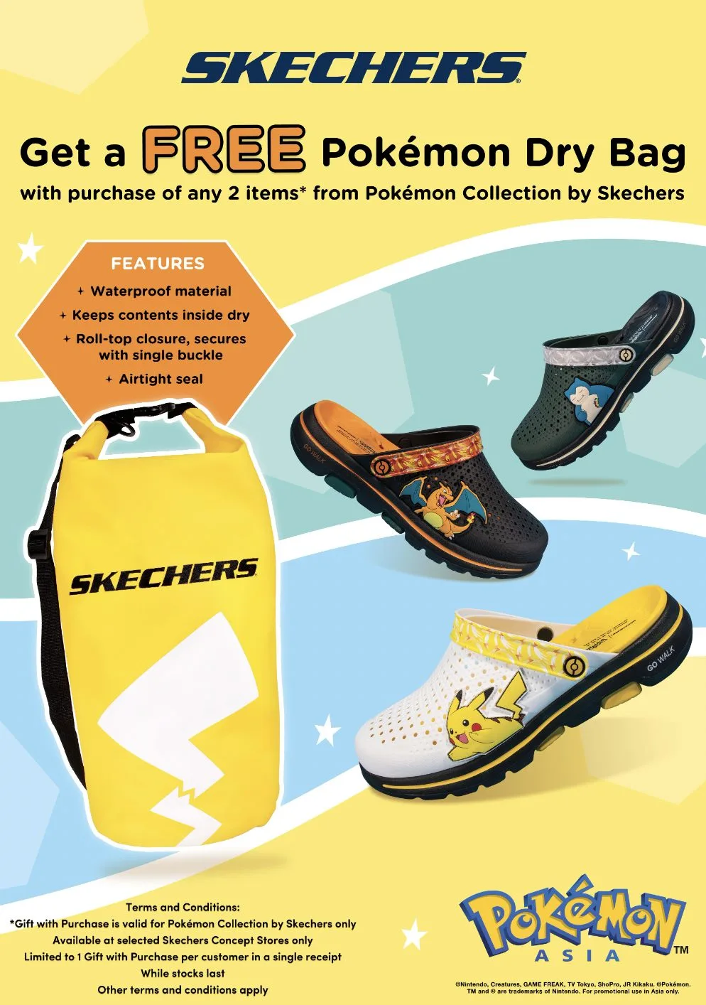 Tak cukup dengan itu, kalau anda beli mana-mana dua item daripada koleksi Pokémon di Skechers Concept Stores, anda akan dapat Pokémon Dry Bag* secara PERCUMA yang mempunyai ciri penutup roll-top yang diikat dengan satu buckle, pengedap kedap udara yang diperbuat dengan bahan kalis air.