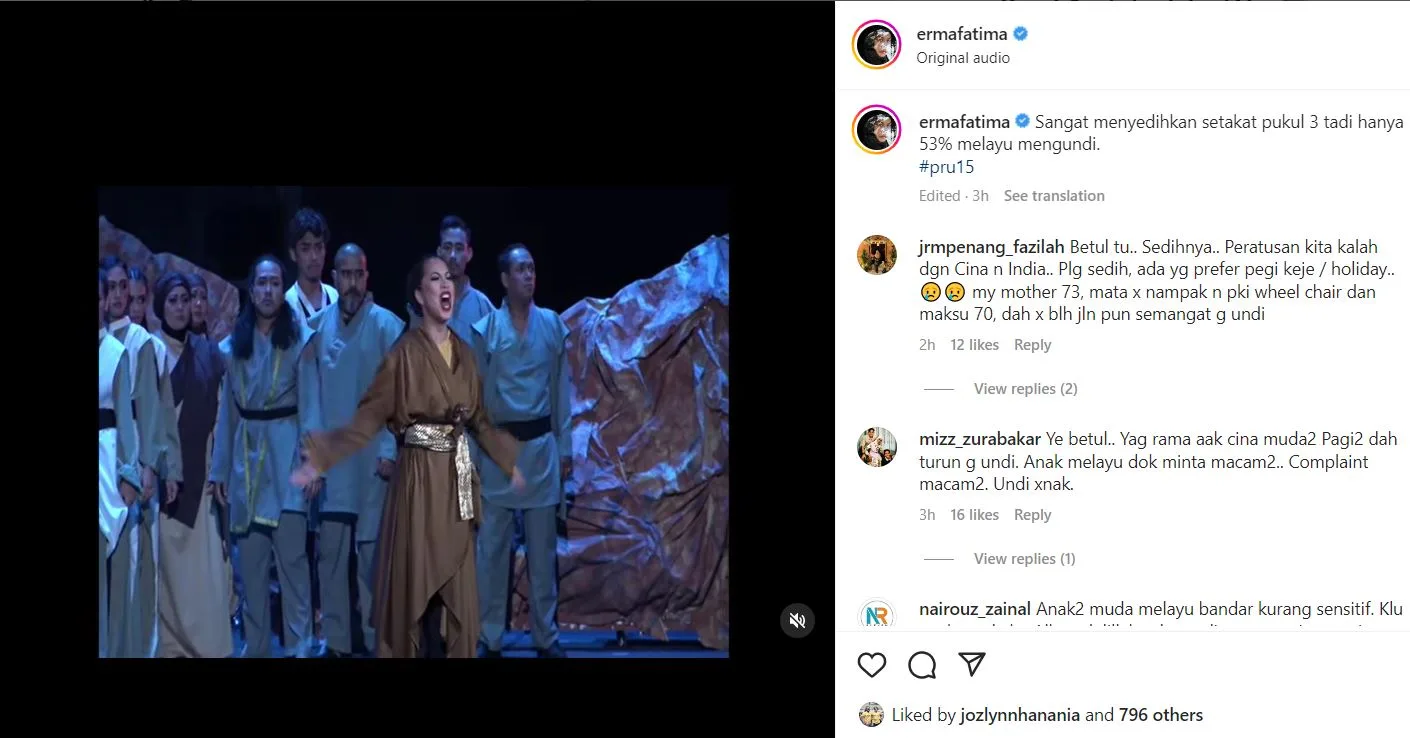 Terbaru, Erma Fatima turut memuat naik satu video di Instagram miliknya mengenai peratusan gologan Melayu yang keluar mengundi semalam sejak jam 3 petang.