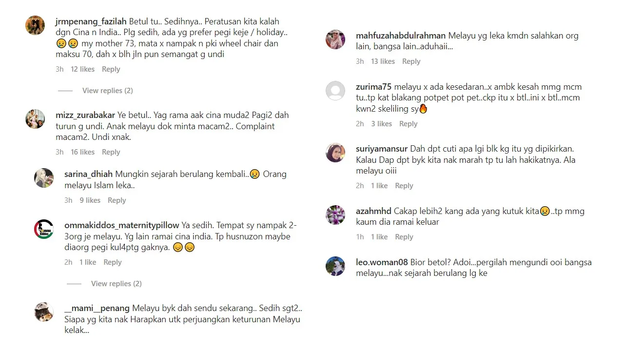 Tulisnya, dia berasa sangat sedih kerana setakat jam 3 petang semalam, peratusan yang hanya keluar mengundi dalam golongan Melayu adalah seramai 53 peratus sahaja.