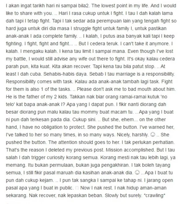 Bagi penulis kalau ada masalah rumah tangga tu perlu berbincang dalam keluarga bukan memuat naik semua benda di media sosial. Itu bukan rumahtangga namanya tapi rumah media sosial.