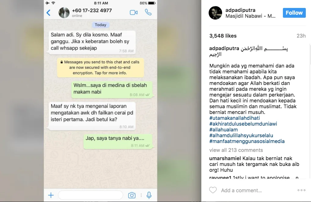 Menerusi Instagram milik Ady sendiri, dia telah mendedahkan satu ‘screenshot’ perbualan dari whatsapp yang bertanya soalan mengenai penceraian ini. Namun Ady memberi respon yang seolah-olah wartawan itu mengganggunya menjalankan ibadah di Makkah.