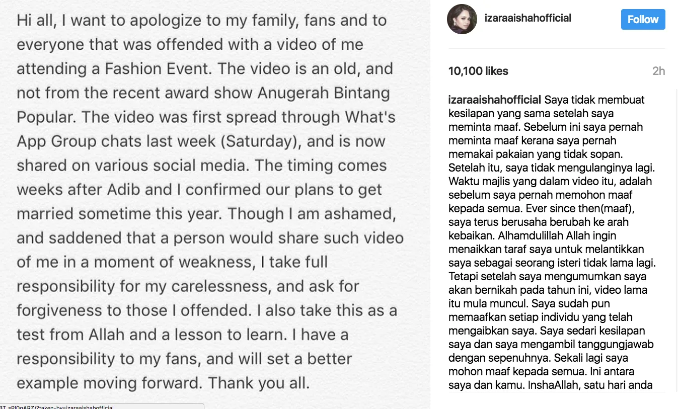 Tetapi setelah saya mengumumkan saya akan bernikah pada tahun ini, video lama itu mula muncul. Saya sudah pun memaafkan setiap individu yang telah mengaibkan saya. Saya sedari kesilapan saya dan saya mengambil tanggungjawab dengan sepenuhnya.