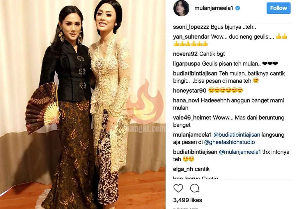 Melalui akaun mulanjameela1 di Instagram, penyanyi Mulan Jameela tampil dengan fotonya memakai baju kebaya moden yang sinonim dengan pakaian tradisional Indonesia. Pelbagai pujian diberikan kepadanya, sehingga ada netizen yang mengatakan tentang beruntungnya Ahmad Dhani mendapat memperisterikan wanita ini.