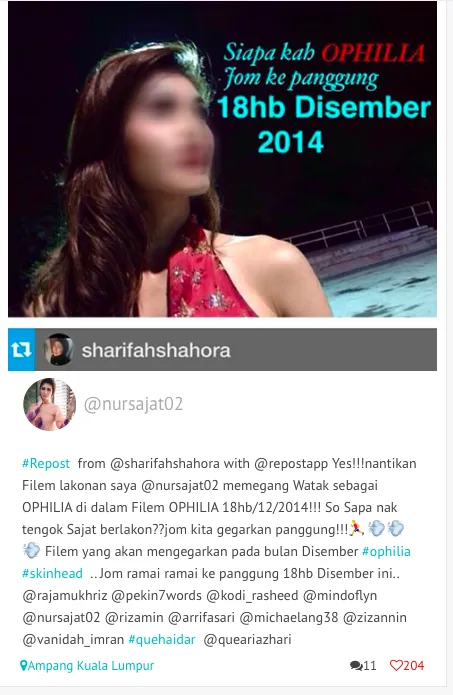 Babak filem Ophilia yang berdurasi lebih dari 2 minit itu telah dikongsi oleh lebih dari 13 ribu pengguna di Twitter. Ophiia pernah ditayangkan pada tahun 2014 menampilkan pelakon terkenal seperti Que Haidar dan Pekin Ibrahim.