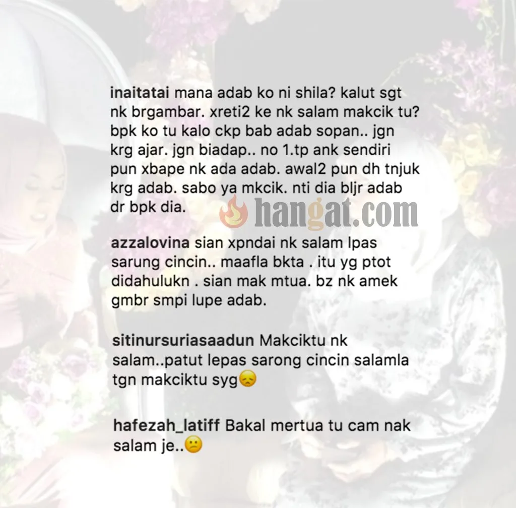 Namun disebalik majlis bahagia ini, ada saja netizen yang melemparkan komen negatif dengan menegur Shila tak pandai bersalam selepas disarung cincin oleh bakal ibu mertuanya. Mungkin iri hati dengan kebahagiaan Shila kecapi sekarang, netizen ini menuduhnya tiada adab ketika berdepan dengan orang tua.
