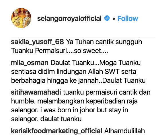 Romantik kan? Menurut tinjauan kami di ruangan komen Instagram @SelangorRoyalOfficial, setiap gambar Tengku Permaisuri Norashikin menerima komen positif dan pujian netizen.
