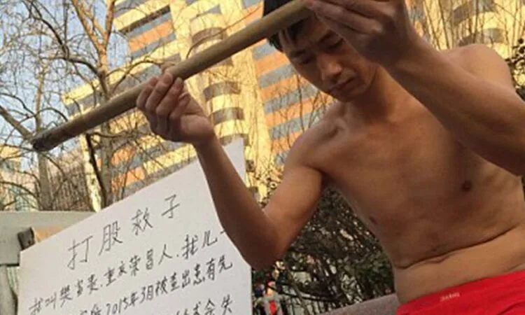 Fan sengaja membogelkan diri untuk menarik perhatian orang. Melalui tulisan di sebuah papan, ia memohon kepada pejalan kaki untuk memukul punggung dan bahagian bawah tubuhnya justeru membayar sebesar CNY 10 atau sama nilai dengan RM6.50. “Orang bermurah hati, bantulah kami” tulisnya dalam papan tersebut.