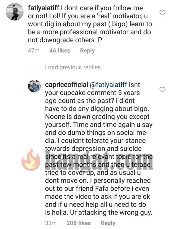 Terdahulu, gara-gara isu cupcakes pelakon Fathia Latiff dilihat mempunyai perselisihan faham dengan penyanyi rap, Caprice di Instagram. Bermula dengan isu tolak pelawaan cupcakes sehinggalah yang terbaru, video Caprice turut ditegur oleh pelakon itu.