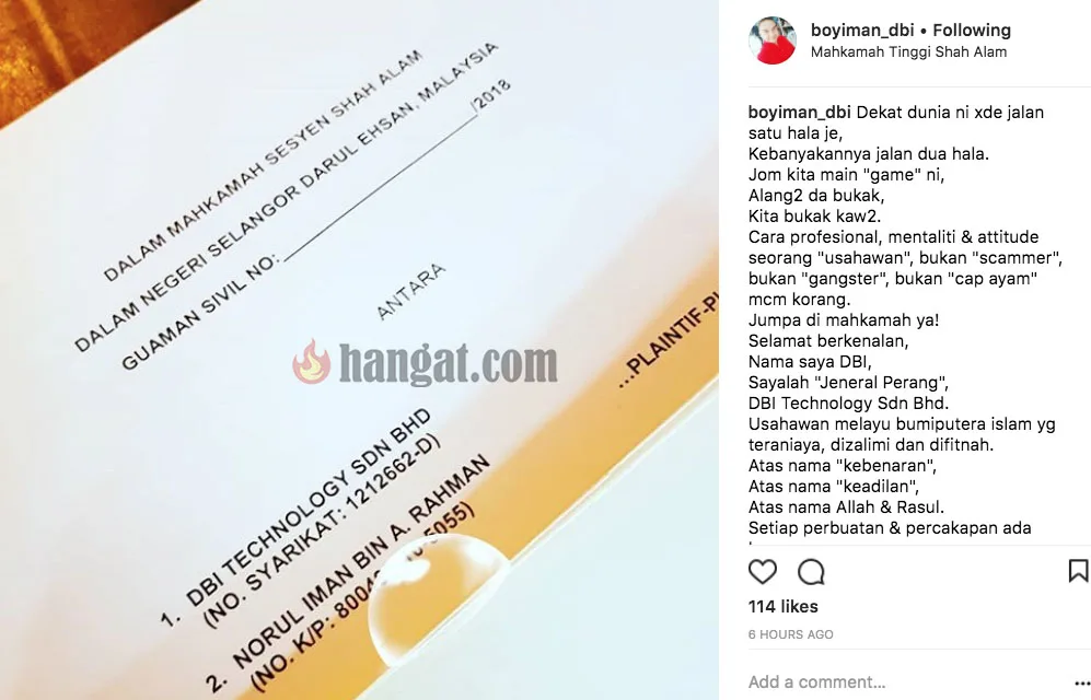 “Dekat dunia ni xde jalan satu hala je, Kebanyakannya jalan dua hala. Jom kita main “game” ni, Alang2 da bukak, Kita bukak kaw2. Cara profesional, mentaliti & attitude seorang “usahawan”, bukan “scammer”, bukan “gangster”, bukan “cap ayam” mcm korang. Jumpa di mahkamah ya!