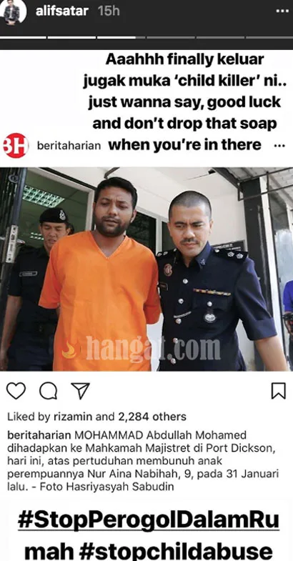 Menerusi kenyataan Aliff Satar di Instagramnya, dia akhirnya dapat melihat wajah pembunuh kanak-kanak kejam ini di akhbar hari ini.