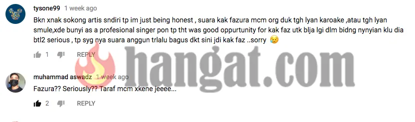 Malah, ada juga peminat daripada Indonesia dan Malaysia yang turut membandingkan mutu vokal Fazura dengan seorang lagi penyanyi terkenal seberang iaitu Rossa yang dianggap jauh lebih bagus daripada pelakon filem J Revolusi itu.