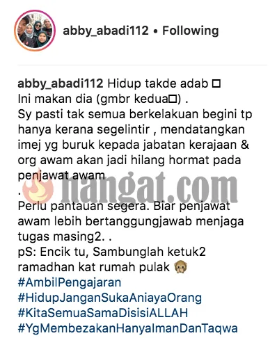 Pelakon dan pendakwah Abby Abadi menyifatkan tindakan pegawai itu seperti tiada adab dan sekaligus telah mendatangkan imej yang buruk kepada jabatan kerajaan.