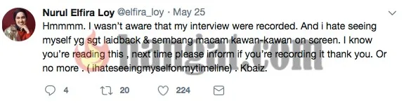 “Hmmmm. I wasn’t aware that my interview was recorded. And I hate seeing myself yang sangat laidback dan sembang macam kawan-kawan on screen. I know you’re reading this, next time please inform if you’re recording it thank you. Or no more (ihateseeingmyselfonmytimeline) . Kbaiz,”