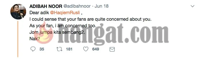 Dalam perkembangan lain, Adibah Noor juga berasa kasihan melihatkan Haqiem apatah lagi dia dituduh sebagai salah satu punca mengapa Haqiem dikatakan mahu membuat keputusan berkenaan.