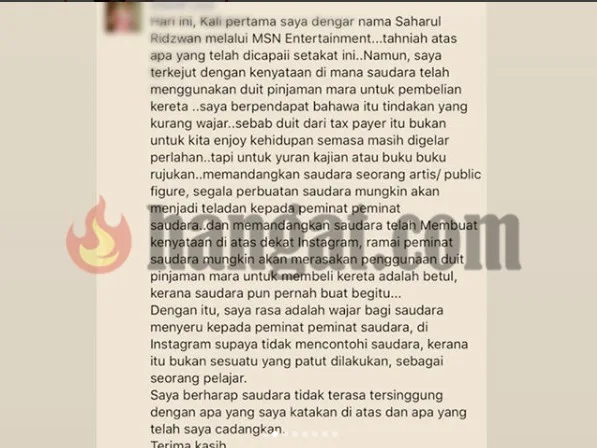 Terdahulu, Saharul pernah berkongsi kisah di mana dia mengaku pernah menggunakan duit pinjaman MARA ketika belajar untuk membeli sebuah kereta Viva.