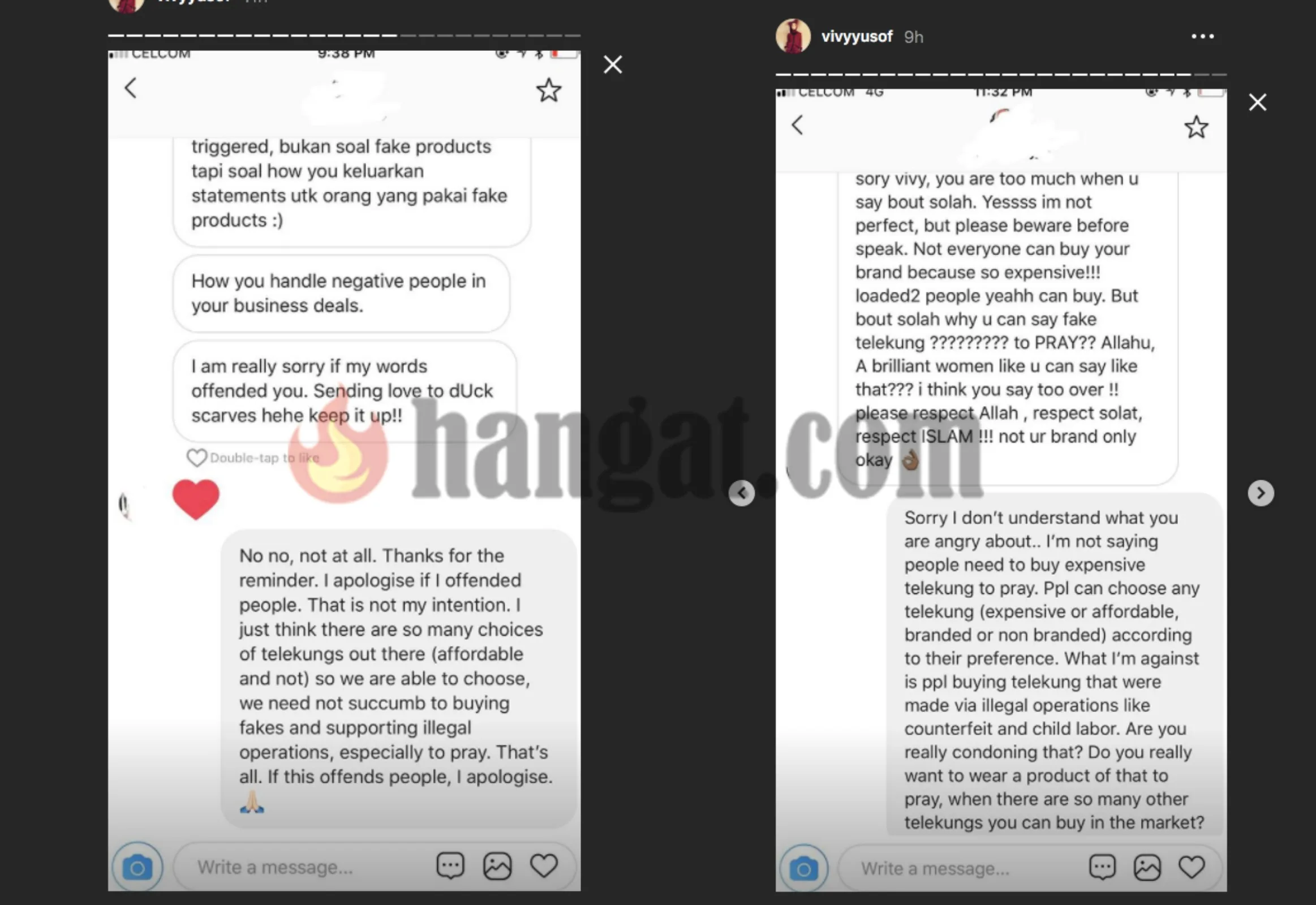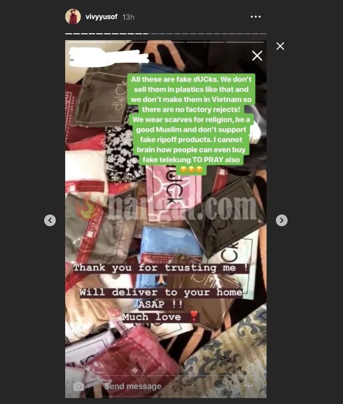 Isu tersebut turut terpalit pada usahawan terkenal, Datin Vivy Yusof yang rasa ‘terpanggil’ untuk menghuraikan isu berkenaan setelah mendapati jenama tudungnya, Duck Scarves turut dieksploitasi sesetengah pihak yang tidak bertanggungjawab. Jelas Vivy menerusi Insta Story nya, koleksi produk keluaran syarikatnya mempunyai ‘trademark’ tersendiri selain mendedahkan beberapa produk tiruan syarikatnya.