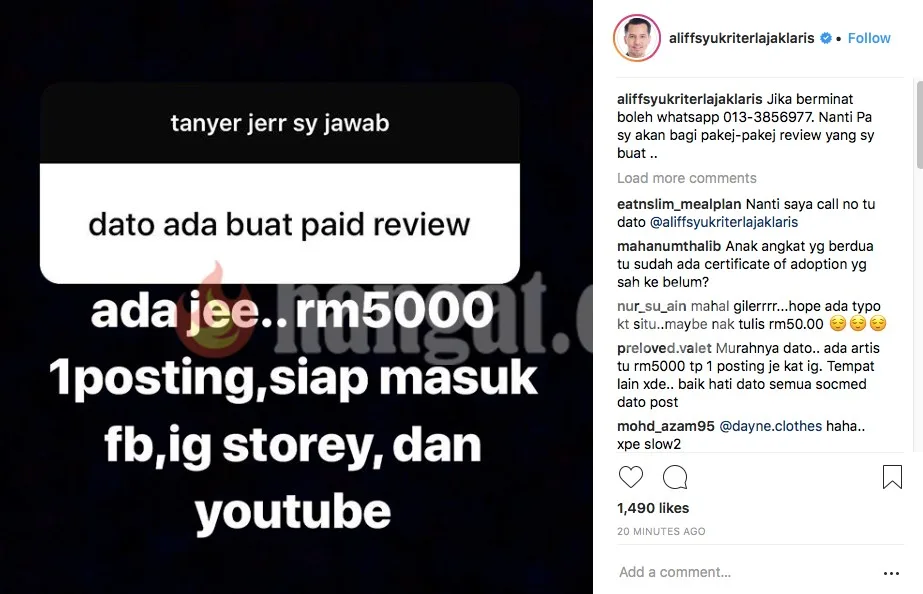 Namun begitu, ketika ditanya berapakah caj yang dikenakan jika mereka ingin menggunakan khidmat Aliff, dia menjawab harga yang dikenakan adalah RM5000 untuk satu posting di media sosialnya. Rata-rata netizen terkejut dengan harga tersebut malah tidak kurang juga yang memerli Aliff menawarkan harga yang terlalu mahal.