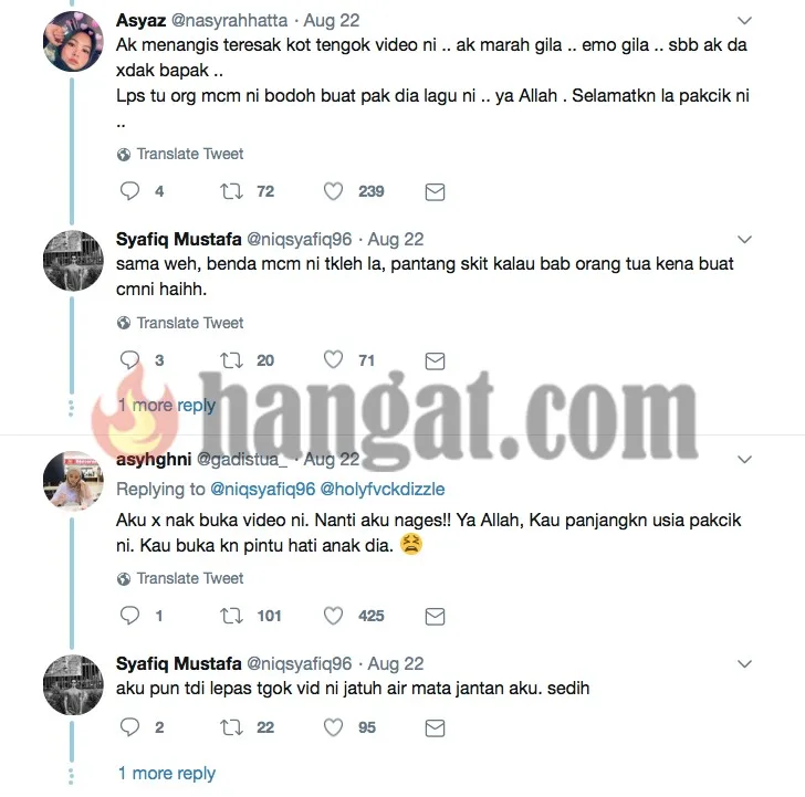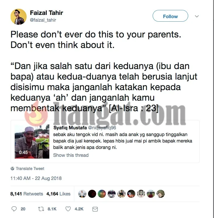 Melihatkan pada video tersebut, penyanyi Faizal Tahir turut terkesan dan tersentuh melihat lelaki dari utara tanah air itu. Menerusi laman Twitter nya, Faizal memberi pesanan khas buat pengikutnya dimana dia mengharapkan agar mereka tidak melakukan perkara seperti itu pada ibubapa masing-masing. Malah dia turut mengharapkan agar mereka menjadi menjaga ibubapa sebaik mungkin dan menghormati mereka.