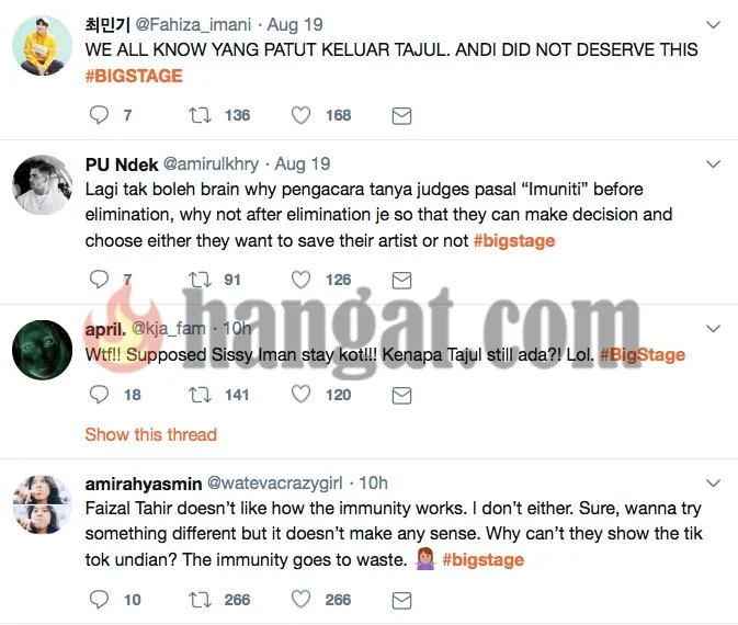 Menghangatkan lagi keadaan, peminat turut menyalahkan Faizal Tahir kerana tindakannya seperti tidak faham dengan konsep program itu. Selain Dato Seri Siti Nurhaliza, penyanyi MahaKarya Cinta itu juga merupakan salah seorang juri tetap Big Stage dan kedua-dua mereka mempunyai kuasa imuniti untuk menyelamatkan mana-mana peserta yang sudah tersingkir.