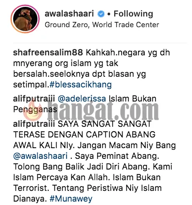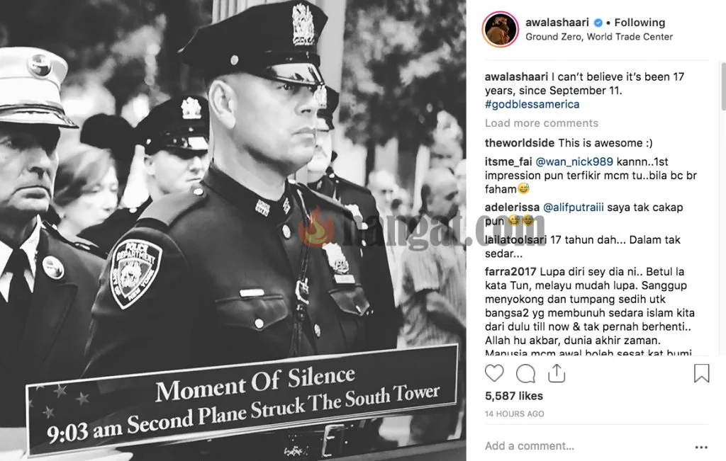 Tragedi penuh bermakna ini turut mendapat perhatian pelakon dan pengacara Awal Ashaari menerusi Instagramnya. Awal bersama isterinya kini berada di kota New York atas urusan kerja dan kebetulan mereka berpeluang untuk bersama-sama rakyat Amerika mengenang kembali tragedi ngeri ini.