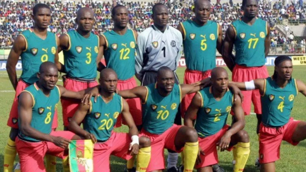 Bukannya terlihat seperti pemain sepak bola, jersi Kamerun yang dikeluarkan pada tahun 2002 tersebut telah membuatkan pemainnya seperti pemain bola keranjang.