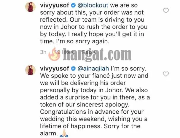 Susulan itu, pemilik FV sendiri, Datin Vivy Yusof telah menjawab keluhan pelanggan tersebut di laman berkenaan. Vivy memohon maaf di atas kelewatan dan memaklumkan dia sudah mengarahkan pekerjanya untuk menghantar terus barang pesanan serta hadiah kejutan kepada pelanggannya pada hari yang sama.