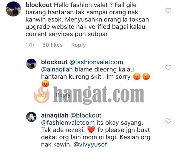 Seperti yang berlaku kepada seorang pelanggan ini membeli barang dari Fashion Valet (FV), hab fesyen tempatan popular di Malaysia. Pelanggan ini mengamok di akaun rasmi Instagram FV, gara-gara barang pesanan tidak sampai. Lebih menyedihkan barang pesanan tersebut merupakan barang hantaran untuk majlis pernikahan yang bakal berlangsung pada keesokan harinya.
