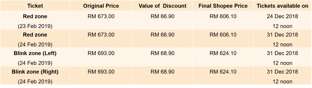 Memandangkan sambutan hangat, BLACKPINK telah bersetuju untuk memanjangan konsert di sini selama dua hari. Diskaun 10% akan diberikan kepada peminat untuk membeli tiket BLACKPINK boleh didapati di YG Entertainment di aplikasi Shopee. Tiket adalah terhad dan seorang pembeli hanya boleh membeli dua tiket bagi setiap transaksi.