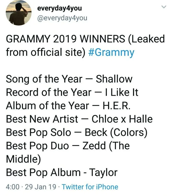 Biarpun belum berlangsung, di media sosial tular mengenai keputusan pemenang-pemenang Anugerah Grammy 2019 yang disebarkan oleh seorang pengguna Twitter.