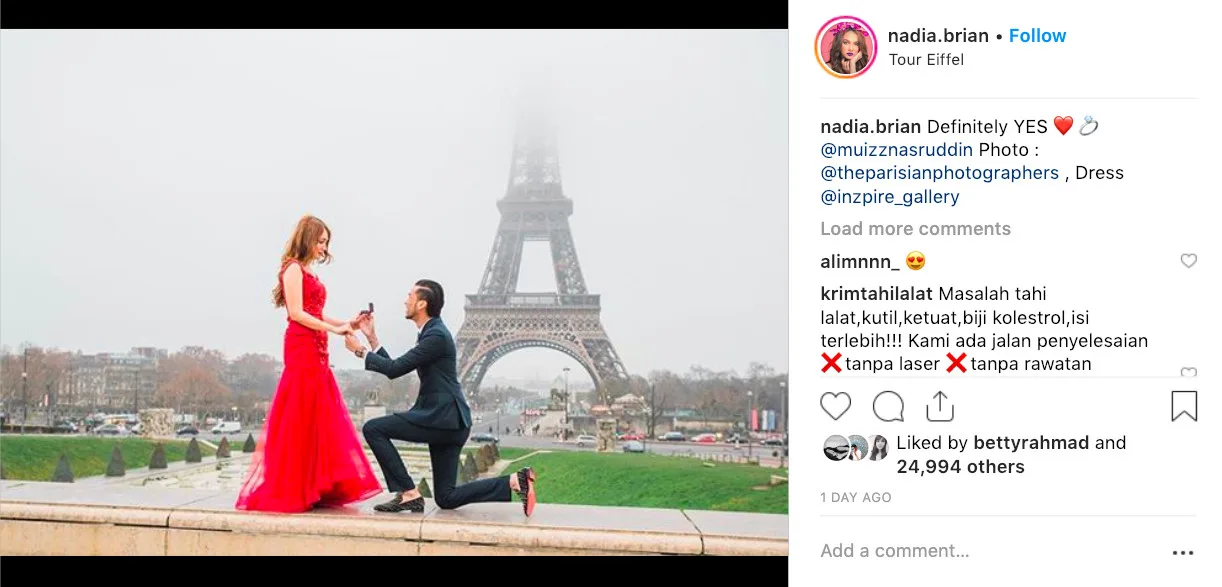 Menerusi entri di Instagramnya, Nadia memuat gambar kekasihnya yang dikenali sebagai Mu’izz Nasruddin sedang melamarnya di hadapan Menara Eiffel, Paris.