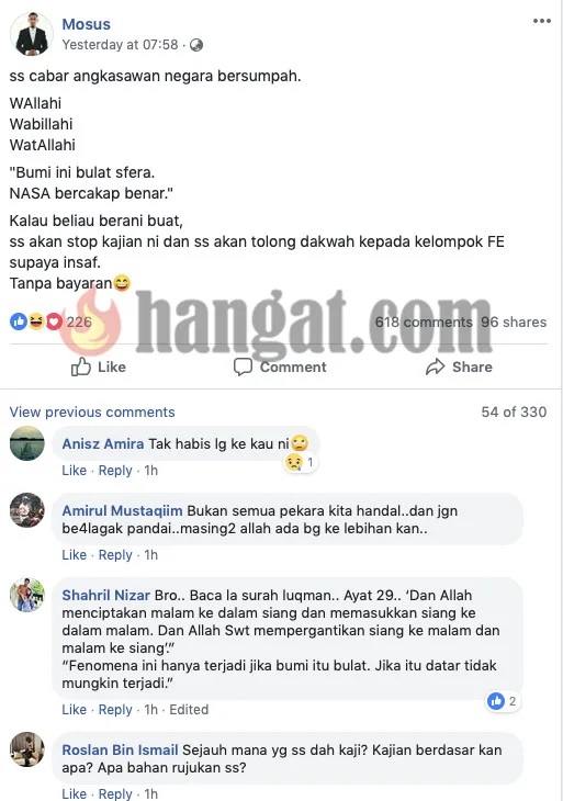 Dalam pada itu, dia juga berjanji akan menghentikan kajiannya sekiranya Dr Sheikh bersumpah mengenai bentuk bumi sebenar.