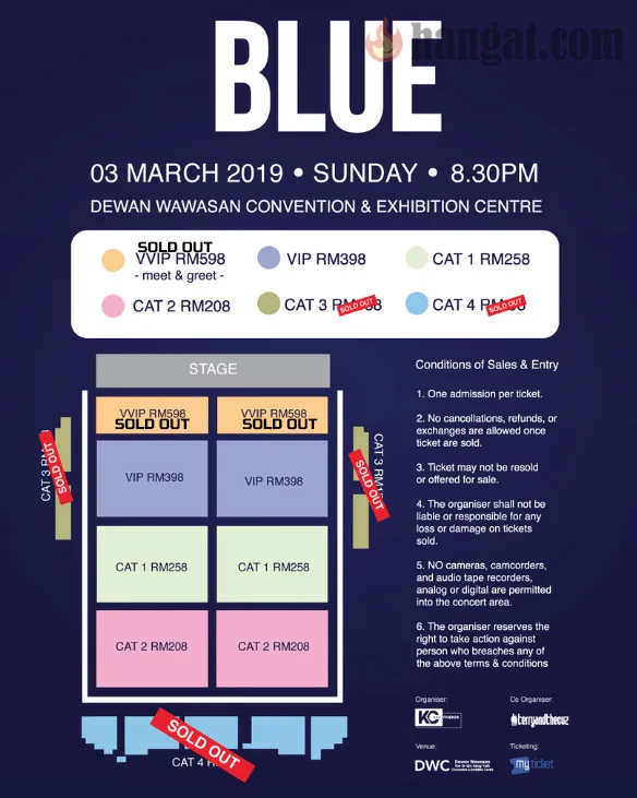 Terbaru, tiket bagi kategori VVIP, CAT 3 dan CAT 4 yang masing-masing berharga RM598, RM158 dan RM98 telah pun habis dijual. Macam goreng pisang panas! Peminat yang merancang untuk ke ‘Blue Live In Malaysia 2019′ bagaimanapun masih boleh mendapatkan tiket-tiket berharga RM398 (VIP), RM208 (CAT 2) dan RM258(CAT 1).