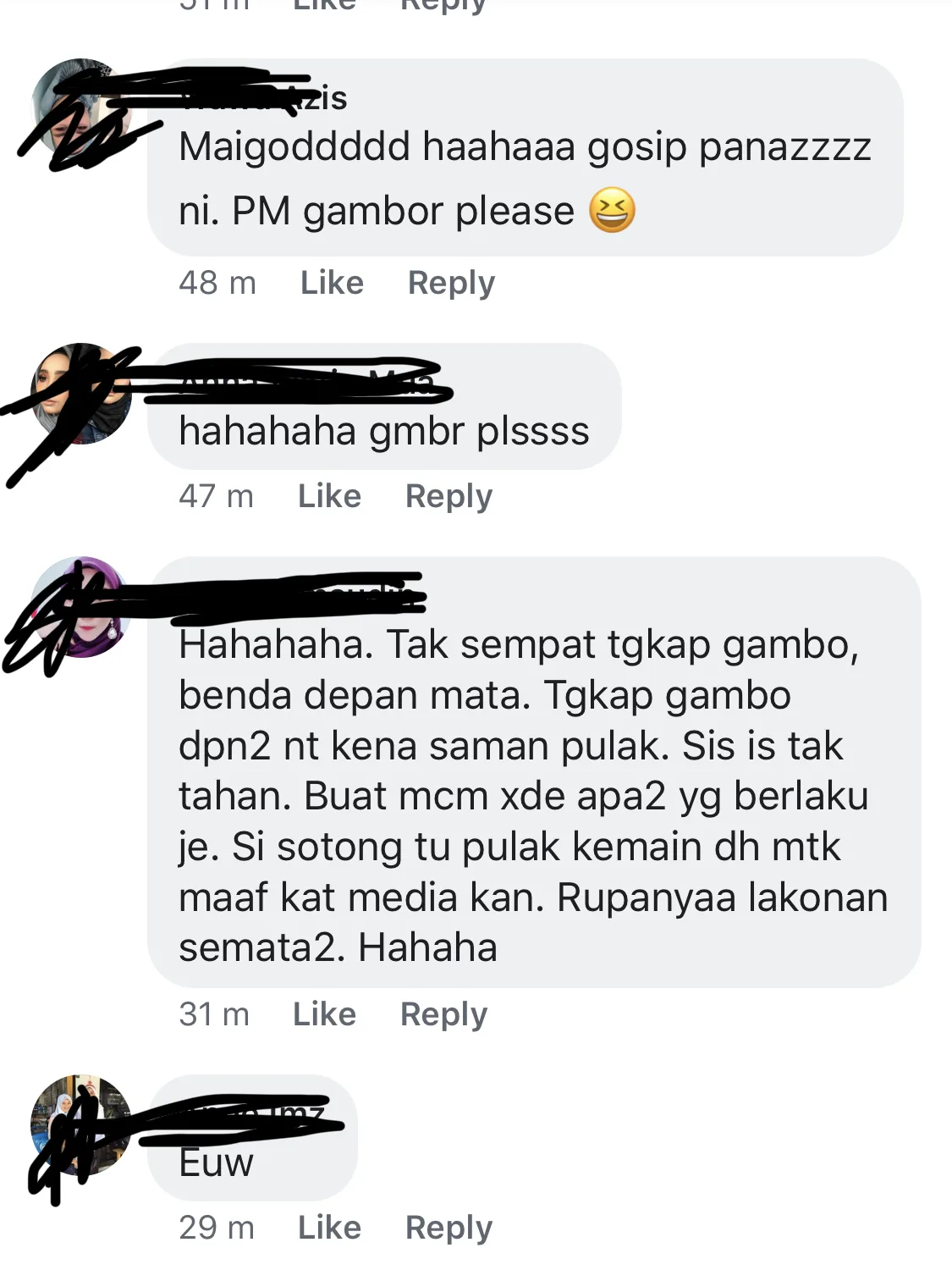 “Hahahaha. Tak sempat tangkap gambar, benda depan mata. Tangkap gambar depan-depan nanti kena saman pula. Sis is tak tahan. Buat mcm tak ada apa-apa yang berlaku je. Si sotong tu pula kemain dah minta maaf dekat media kan. Rupanya lakonan semata-mata. Hahaha,” ujarnya.
