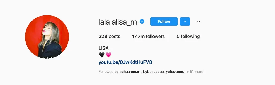 Menurut sumber media di negara itu, salah seorang ahli kumpulan Blackpink, Lisa telah diiktiraf sebagai selebriti Korea yang mempunyai jumlah pengikut yang paling ramai di Instagram. Siapa sangka, biarpun Lisa baru sahaja membuka akaunnya itu pada tujuh bulan yang lalu, namun sehingga kini, penyanyi yang berasal dari Thailand itu mencatat 17.7 juta pengikut di laman sosial itu.