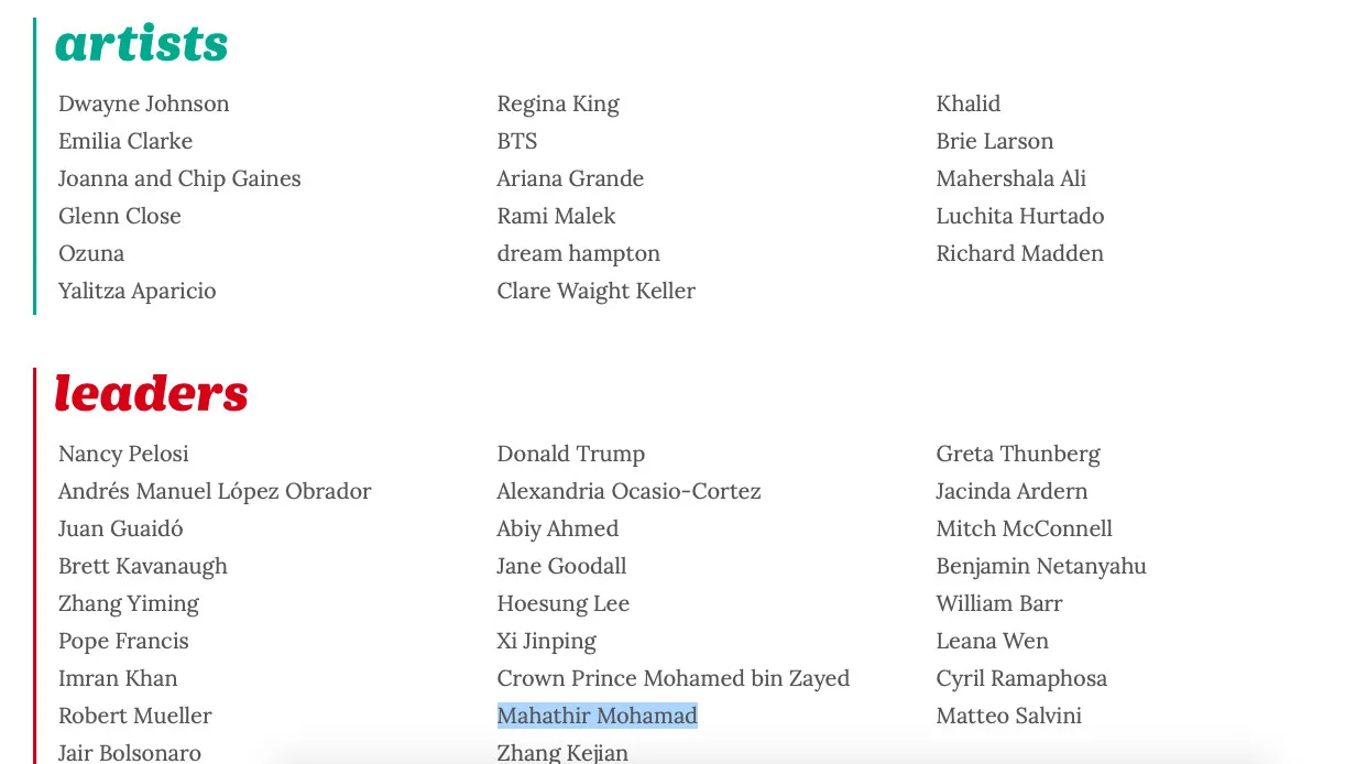 Sesuatu yang membanggakan buat Malaysia, apabila Perdana Menteri Tun Dr Mahathir Mohamad tersenarai bersama beberapa nama besar lain dalam kategori pemimpin paling berpengaruh, disamping Presiden Amerika Syarikat (AS), Donald Trump, Presiden China Xi Jinping, PM New Zealand, Jacinda Adern dan