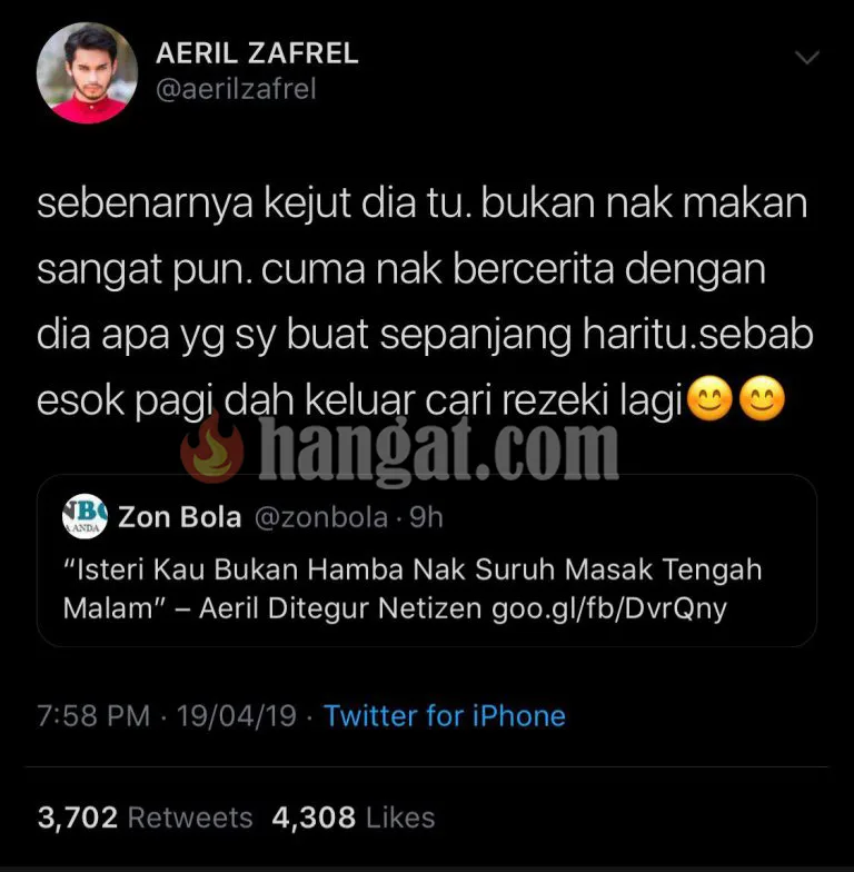 Aeril yang tidak mahu isu itu terus berpanjangan, beliau tampil menjelaskan situasi sebenar. Jelas Aeril, itu adalah caranya untuk meluangkan masa bersama isteri dan berkongsi cerita tentang apa berlaku sepanjang hari memandangkan keesokan paginya dia akan keluar mencari rezeki.