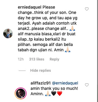 Seperti akur dengan kecaman yang diterima, pelakon itu membalas komen-komen tersebut dengan nada positif. Aliff dan Bella disahkan bercerai talak satu pada 16 Mei lalu dan hasil perkongsian hidup mereka dikurniakan seorang anak Mohamad Ayden Adrean, 2.