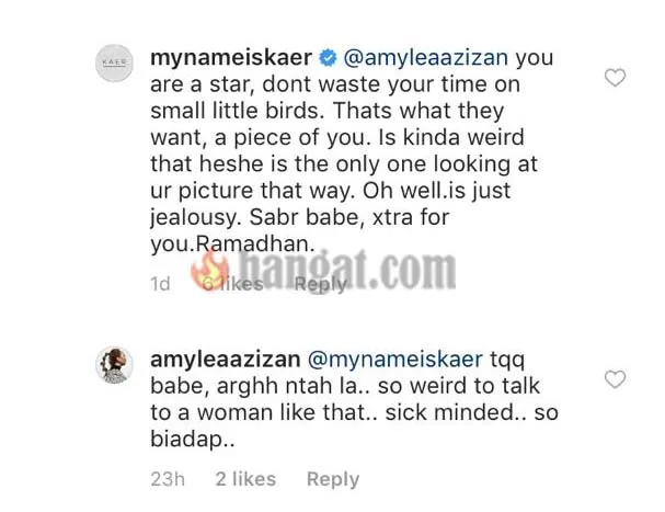 Bagaimanapun, Amylea menganggap kelakuan buruk dan tuduhan netizen itu mampu menambahkan pahala nya di bulan Ramadan ini. Dalam masa yang sama, di ruangan komen tersebut ,terlihat penyanyi Kaer Azami memberi nasihat kepada Amylea supaya bersabar dan tidak membuang masa melayan segelintir netizen yang menagih perhatian seperti ini.