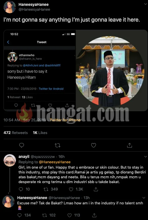 Sebelum ini, model dan pelakon baharu Haneesya Hani pernah menjadi mangsa ‘body shaming’ oleh pengguna media sosial yang mengutuk warna kulitnya.