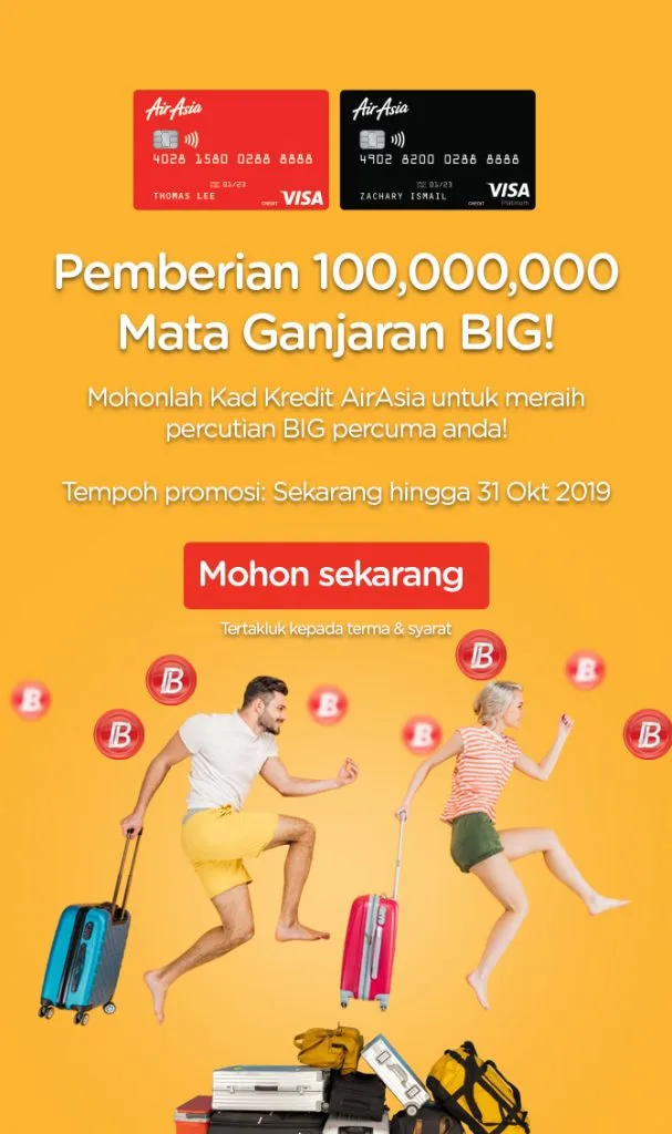 Bukan 1 juta, bukan 10 juta tetapi 100 juta! Itulah jumlah Mata Ganjaran BIG terbesar yang diberikan oleh AirAsia BIG di bulan Oktober ini. Dari sekarang hingga 31 Oktober 2019, permohonan untuk Kad Kredit AirAsia akan dikumpulkan dan lebih banyak permohonan yang diterima, lebih banyak Mata Ganjaran BIG akan diberikan untuk semua permohonan yang diluluskan!