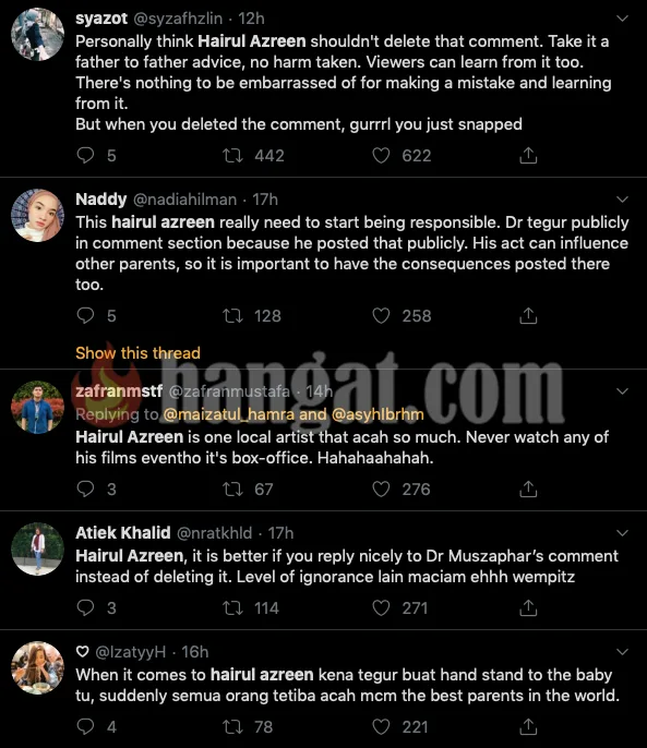 Melihatkan pada komen itu, menurut netizen Hairul telah bertindak memadam komen teguran itu sehingga membuatkan ramai yang mula berasa hilang hormat dengan pelakon itu.