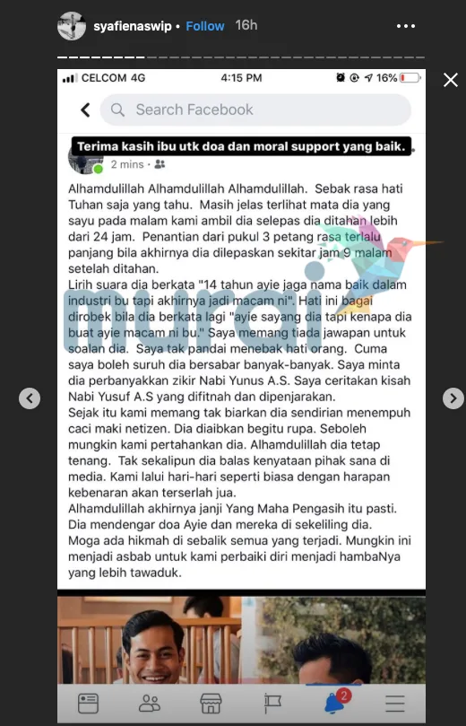 Dalam pada itu, Syafie meluahkan rasa syukur dan terima kasih yang tidak terhingga kepada semua keluarga serta peminat yang telah mendoakannya dan memberi kata-kata semangat selama ini.