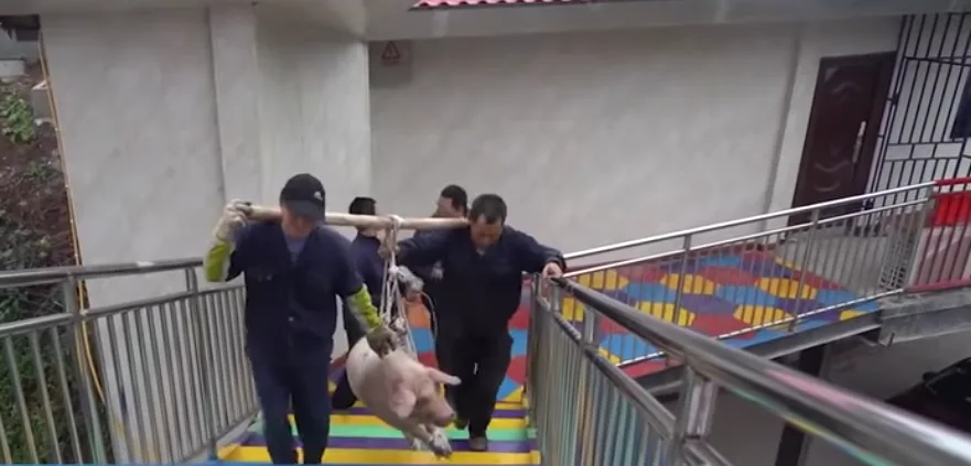 Lebih kejam, babi itu tidak ditarik ke atas, sebalikna ia dibiarkan tergantung selama beberap minit untuk dijadikan tontonan orang ramai.