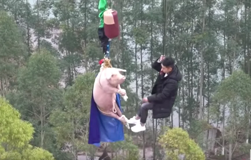Dipetik dari BBC, insiden babi melakukan bungee jumping itu diketahui berlaku di sebuah taman hiburan yang dikenali dengan nama Meixin Red Wine Town Theme Park di Chongqing, China.