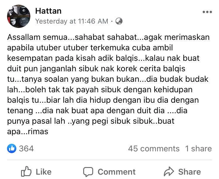Hattan menyelar tindakan para Youtuber terkemuka yang menggunakan kisah keperitan hidup Balqis demi mengaut keuntungan sahaja serta meraih perhatian sehingga ia menjejaskan kehidupan pelakon cilik itu.