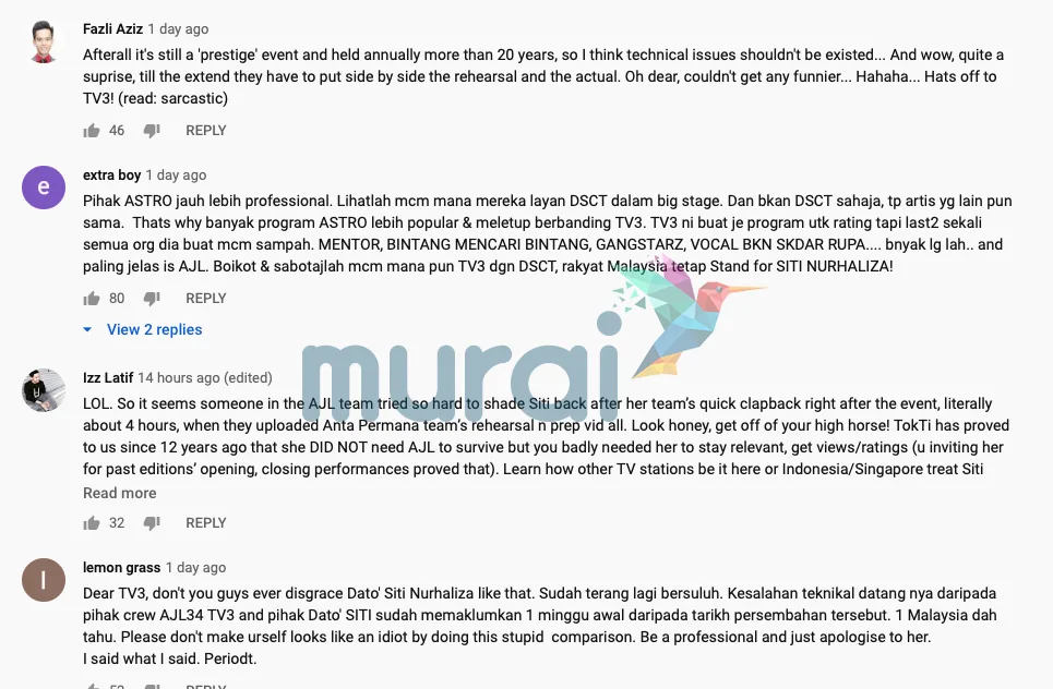 Hasil carian Murai.my mendapati video tersebut yang kini mencecah lebih dari 13 ribu tontonan mendapat lebih dari 800 tanda kurang suka (dislike) berbanding dari tanda suka (like) iaitu kurang dari 100. Ini kerana menerusi ruangan komen rata-rata peminat beranggapan pihak stesen televisyen tersebut seperti kurang professional selain menuntut mereka membuat permohonan maaf gara-gara kerana insiden baru-baru ini.