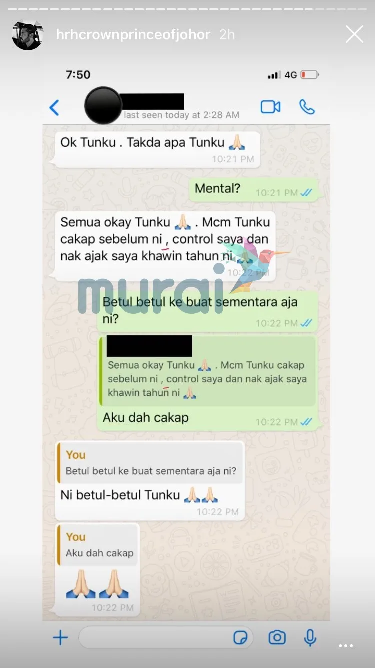 Dalam status yang dimuatnaik Tunku Ismail Idris atau lebih dikenali sebagai TMJ menerusi laman Insta-story, kelihatan suntingan perbualan baginda di laman WhatsApp bersama seorang pemain bola.