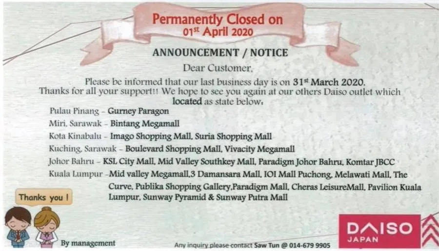 Beberapa hari sebelum ini, orang ramai kecoh dengan berita penutupan kedai serbaneka kegemaran mereka Daiso akan ditutup serta merta bermula 1 April. Kekecohan ini bermula selepas kedai yang berasal dari Jepun itu mengeluarkan poster mengenai penutupannya dan menjadi tular di laman media sosial.